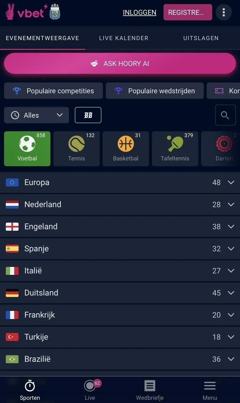 Sportweddenschappen zijn VBET’s sterkste punt, met nadruk op voetbal (Eredivisie, Champions League), basketbal, en tennis. Ik plaatste een €10 weddenschap op Ajax-PSV (odds 2,15 vs. marktgemiddelde 2,05) en won €21,50. BetBuilder (bijv. “doelpunt na 15 minuten + gele kaart”) was intuïtief, maar Cash Out is beperkt tot specifieke weddenschappen. Live betting is responsief, met odds-updates elke 10 seconden. Tip: test BetBuilder met €2–5 inzetten.